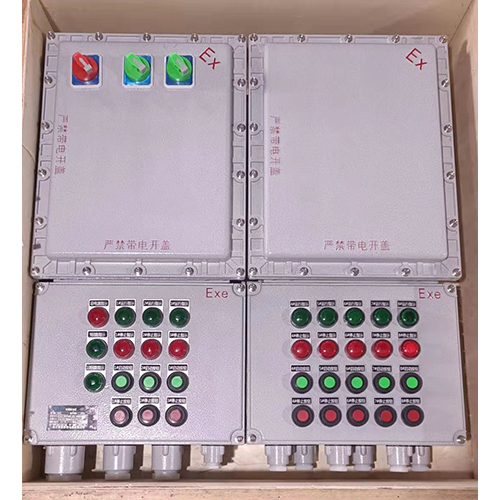 控制箱的外殼是用高強度鋁合金鑄造或優(yōu)質(zhì)鋼板焊接制成,內(nèi)腔空氣開關(guān),通過蓋上的手柄及傳動機構(gòu)操作開關(guān),蓋和體用螺絲緊固,蓋上標(biāo)明“嚴(yán)禁帶電開蓋”警告牌以保安全,主副腔有接線連接端子,引出線口中用G1/2~G4的鋼管或不同外徑橡膠電纜作進出線用。
